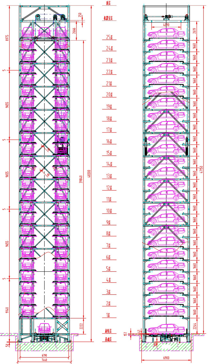 塔式立体车库设备 垂直升降(塔式)停车设备的工作原理是:用提升机将车辆或载车板升降到指定层,然后用横移机构将提升机上的车辆或载车板送入存车位。或是相反,通过横移机械将指定存车位上的车辆或载车
