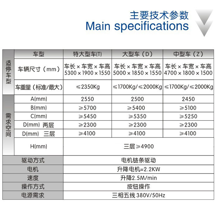 基坑三层升降 运行原理 该设备每组上中下三个车台板为一体,同时做升降运动。机械下降到最低的时候,上层车台板正好与地面平,此时上层车位可以进出车辆。机械上升到中层车台板与地面平时,机械停止,此时中层车位